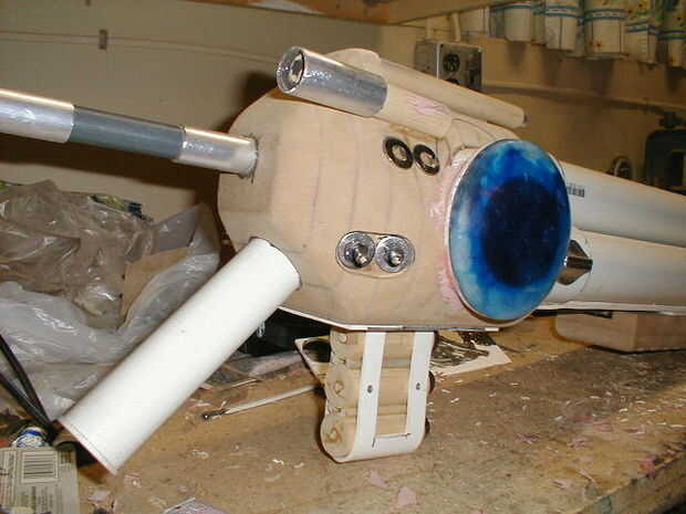Ahora llevaba un fuste en la parte posterior del cuerpo principal blaster para el stock del hombro. Esto fue hecha de secciones de un par de tubos de aluminio con una varilla de plástico pegada en. La parte del hombro fue hecha de MDF. Luego se agujerea otro agujero en la parte inferior de la pistola y la empuñadura se ajustaron en su lugar. Los detalles en el lado del cuerpo de blaster son púas de la manguera y arandelas pegadas en tubos tan claro pueden agregarse más adelante.