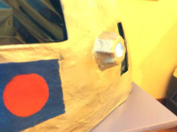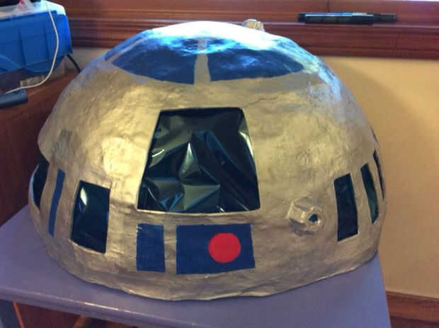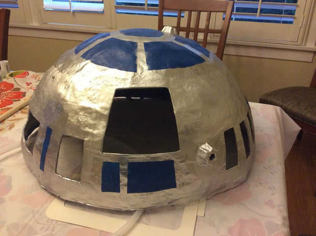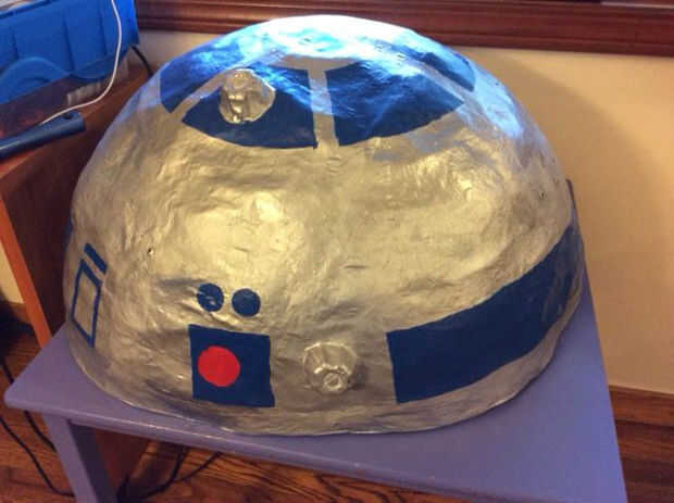 - Coloque las perillas con tiras de papel maché actuando como cinta pegajosa (tal vez funcionaría cinta adhesiva, pero no estaba seguro). Las perillas son corte de cartones de huevos. Corte un agujero circular en la perilla en el frente, por lo que pude la cuña en una linterna (o un proyector de holograma)--es lo azul en la foto del paso anterior (la cinta blanca sosteniendo la correa de la nota). El niño envuelto el extremo del negocio de la linterna en unas pocas capas de celofán azul, por lo que sería la luz azulada, igual real R2.