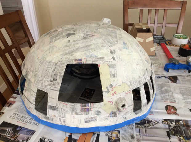 - Corte los orificios para que el niño pueda ver. Tuve el niño poner el sombrero y marcar el interior de la cúpula frente a sus ojos, así que pude corte la gran plaza alrededor de eso. También corté algunas plazas más pequeñas hacia fuera, pensando que la posibilidad de la visión periférica no es una mala idea. Dibujaba algunas pautas con lápiz y utilizar mi cuchillo suizo del ejército. Resulta que el papel maché es fácil de cortar.