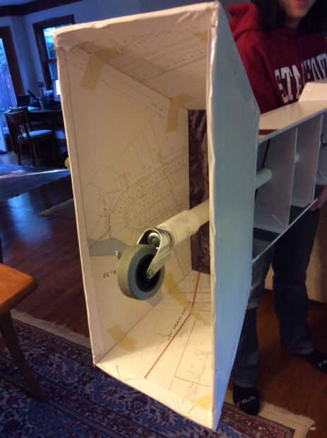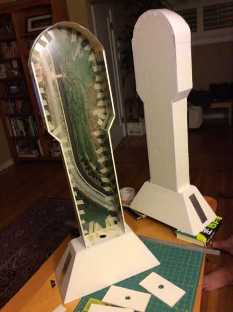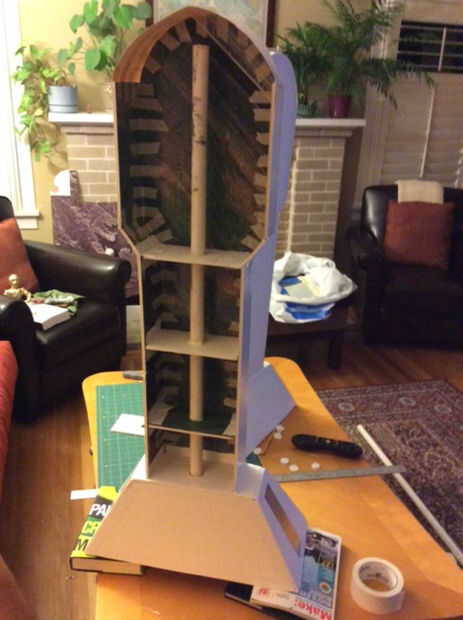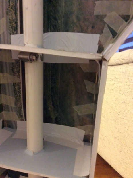 - Cortar las formas de la pierna de base de la espuma, todo excepto la parte superior curvada parte, que es una carpeta de archivo de manila (cartón corrugado no la curva muy bien) cubierto de cinta aislante blanca. Únalos con cinta adhesiva.