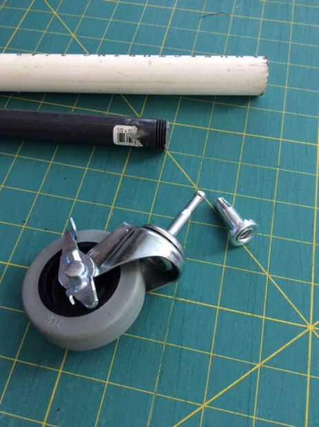- Fije las ruedas (ruedas ligero va a hacer, que tenía de un anterior proyecto) a la parte inferior de los tubos de PVC. Me olvide de tomar una foto sin montar, pero tapa la parte inferior de la pierna del PVC con un roscado casquillo reductor (como este). En primer lugar, taladré un agujero en el buje para que el extremo cónico del lanzador titular metal thingy (véase la primera foto) encajaría a través de él, entonces roscado en un pezón y cortarlo al ras con el buje (el tubo gris que ves en la primera foto es lo que queda de la entrerrosca) y luego rompió el metal thingy dentro del buje. Apreté un poco epoxi de dos partes en las obras, para la buena medida. Luego coloque la rueda en el metal thingy y al conjunto entero de la pierna del PVC con un acoplador (que es todo lo que puede ver en la segunda foto, la rueda de conectados y el acoplador). Lo principal es colocar cualquier ruedas llegas bien a las piernas. Mi respaldo, si el viaje a la nave de plomería no filtró hacia fuera, era utilizar un bloque de madera, algunos tornillos y algunos inteligencia.