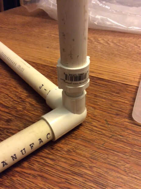 - Utilizar un conector de 3 vías para unir dos tubos de PVC más cortos para hacer pies de soporte. Voy a usar algun pegamento de tubo para fijarlo. Además, creo que voy a llenar los pies con hormigón, para hacer el soporte más estable.