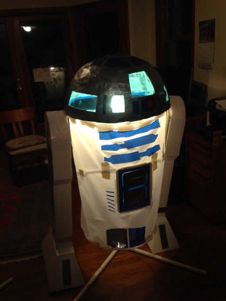 Así, el niño está encantado con el traje, pero la mamá era un poco como "¿qué diablos se supone que debemos con este gigante R2 traje ahora?" Para granjearse el favor de la mamá, le dije que hacer un stand para R2, por lo que la cabeza y el cuerpo sólo tomarían la huella del traje de una vez. Pero entonces, el siguiente paso obvio es hacer todo en una lámpara, por supuesto!