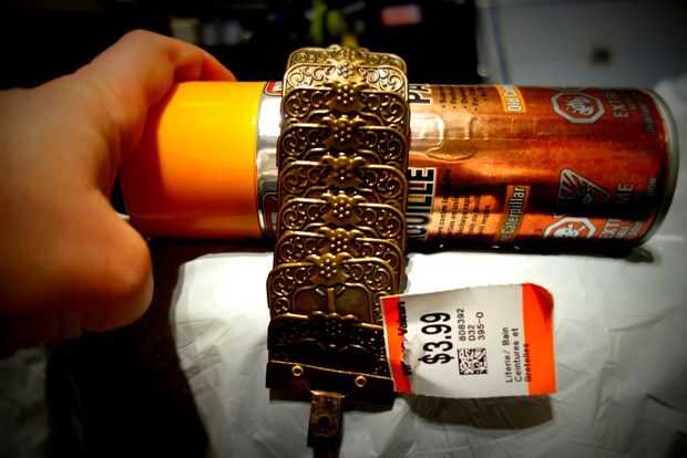 Necesitaba usar mi chilaba marroquí (abrigos del norte de África parecen túnicas Jedi) para su capilla profundo para cubrir el enorme engranaje principal. Sin embargo esto no fue muy "Zeusy" y carecía de detalle. Así que compré un cinturón estampado metal de valor pueblo y aerosol pintado amarillo a la altura de mi perno. Alargó con alambre eléctrico para permitir su uso como una bandolera.