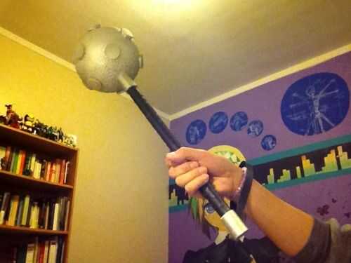 Tomé un trozo de tubo de PVC 4 pulgadas y unido a una tapa de PVC. Entonces al que tapa un trozo largo de tubo de PVC y atascado dentro de una bola de espuma de poliestireno de 8 pulgadas. Tomé algunos espuma de alta densidad que tenía colocación alrededor y cortar en círculos y colocar alrededor de la bola de espuma de poliestireno. Tengo algunos cuero falso y envuelto alrededor de la tubería de PVC. también hizo una correa de cuero. tengo una tapa para el tubo de PVC y ponerlo al final de la maza.