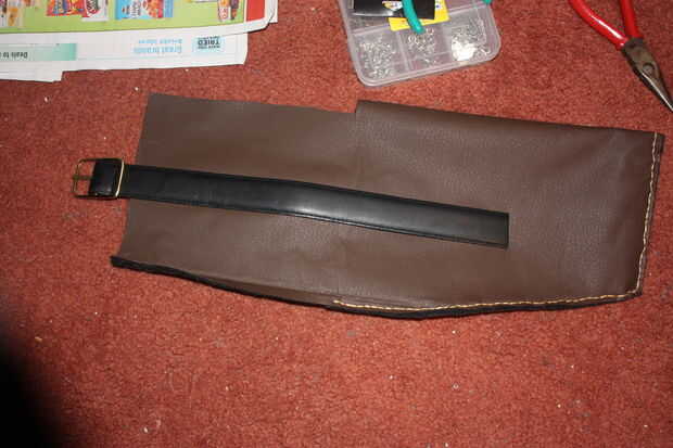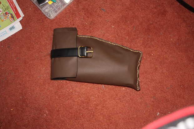 La "correa" de la funda es una tienda de dólar cinturón infantil corte por la mitad y caliente pegado a la solapa superior de la funda. También dejó seguir parte del camino hacia atrás y dejó un "hueco" en el pegamento aferrarse para que una correa se podría pasar a través del orificio. Pensaba para coser la cinta y poner la parte inferior la mitad de la cinta en la parte delantera por lo que podría ser abrochado... pero me quedo sin tiempo, y así lo hice de esta manera.