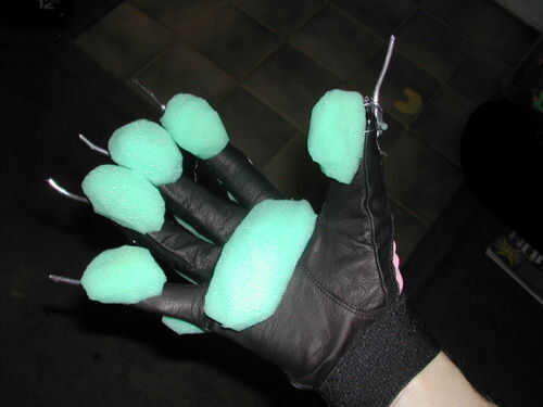 La espuma sobre un guante de bateadores de béisbol. Pegamento caliente en. Los cables hará que los robustas garras encima de los dedos (las garras se ajuste sobre el alambre, crear un orificio en la uña con la herramienta dremel). La espuma hace que mi mano como tiene distintas articulaciones stubbier y esperemos que un poco menos humanos.