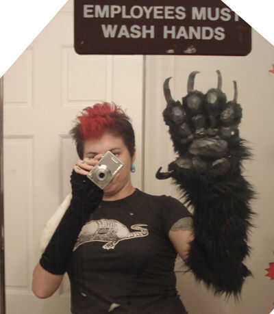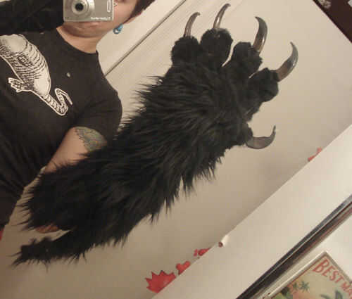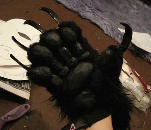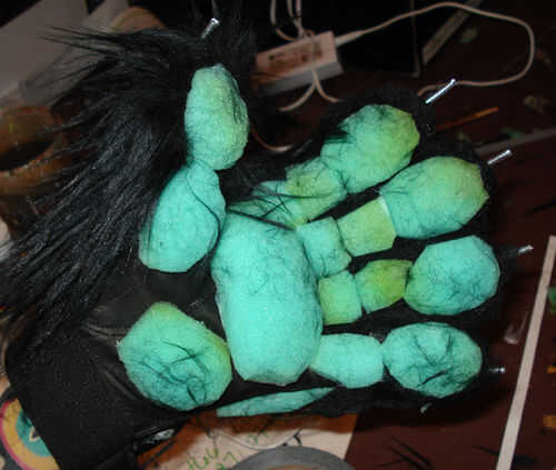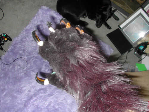 Pegue las garras al cable con epoxy a dedo. Pintar tus uñas y sellarlo con el epóxido claro. Primero pinté las almohadillas de la pata con el látex para reducir a los poros de la espuma, la que pasó con la punta de la herramienta negra. (hay mejores formas de hacer las almohadillas de la pata, pero esto es lo que hice) He afeitado abajo la piel de punta de dedo y dejarla desaparecer en más pelo en el dorso de la mano.