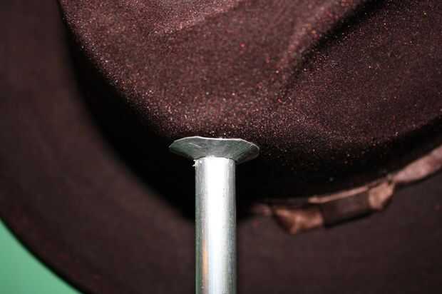 Sujete ambos mangos al sombrero poniendo los extremos más cortos de las manijas en el espacio entre los tubos internos y externos de los carretes de hilo que ha ahuecado. Debe encajar bastante bien.