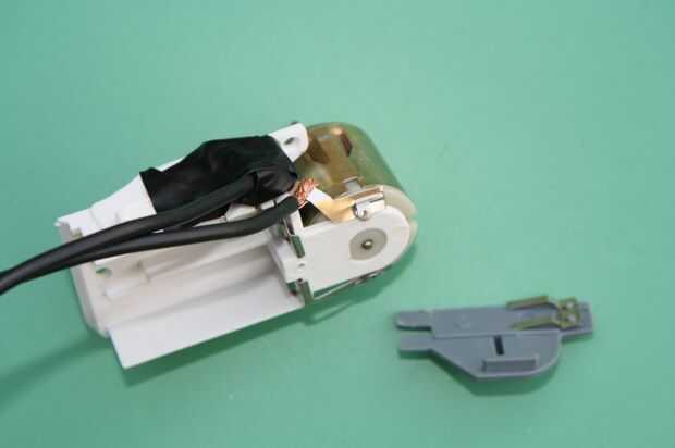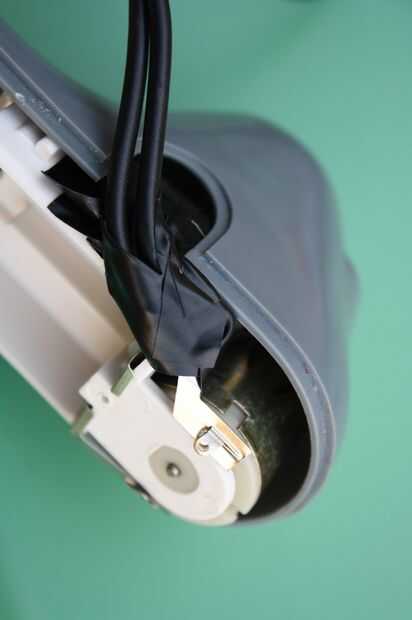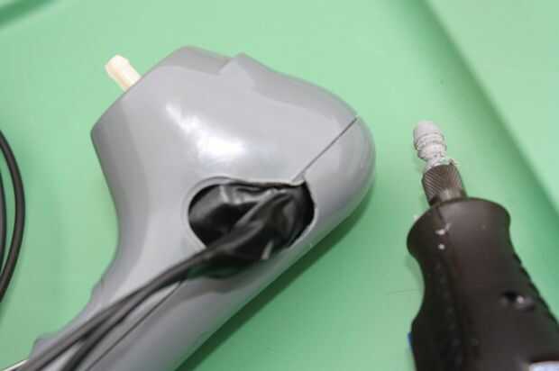 Intente poner el componente de motor en la caja de plástico con los hilos que salen del agujero donde el interruptor on-off solía ser. Si no cabe, marque en el caso donde los cables están bloqueando. Utilice el cono de dremel (tungsteno) herramienta de pulido para ampliar el interruptor de apertura en la parte superior + inferior piezas del caso para que puedan cerrar alrededor de los cables.