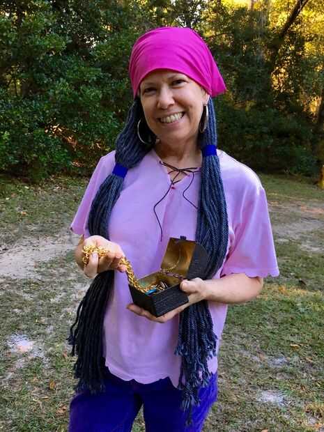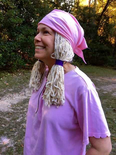 Con dos nietos de 5 y 2, soy bastante culturalmente alfabetizado sobre iluminación y amigos, Ryder y sus amigos mucho y Jake y su pequeña banda de piratas. El año pasado para Halloween, nieto Tyler, me quería vestir como Izzy como él era vestirse como Jake. Como mi cabello es corto y gris, necesitaba una peluca. Diseñé uno con hilo cosido en un pañuelo. La idea podría ser adaptada a otras necesidades de vestuario.