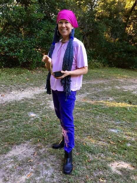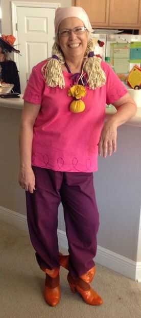 Paso 10: Añadir un color de rosa superior, vieiras cortan las mangas y el dobladillo, añadir un muy reducido criss cruz cierre, pantalones púrpura, pendientes de aro grandes, botas y usted tiene usted mismo un disfraz de Izzy, pero mi caso, es un traje de abuela de Izzy!