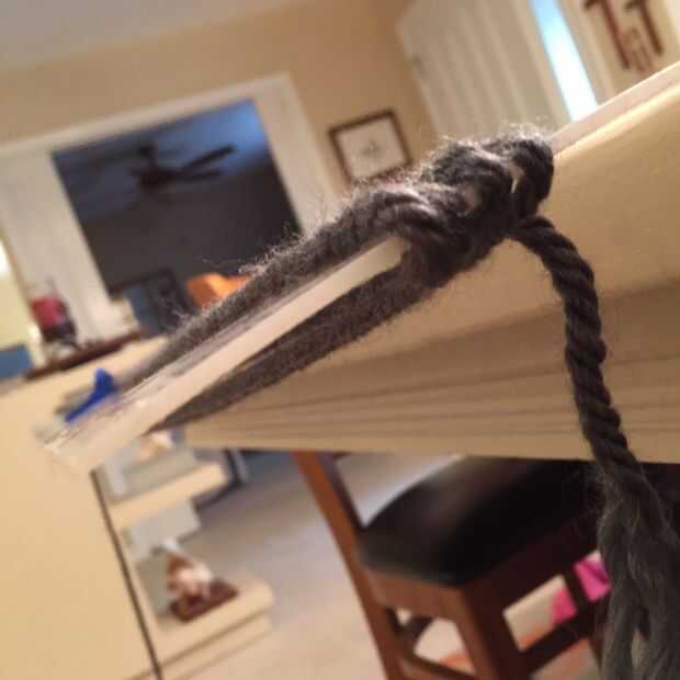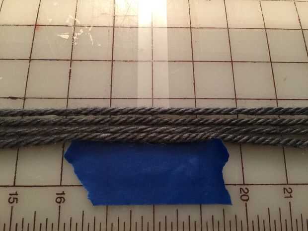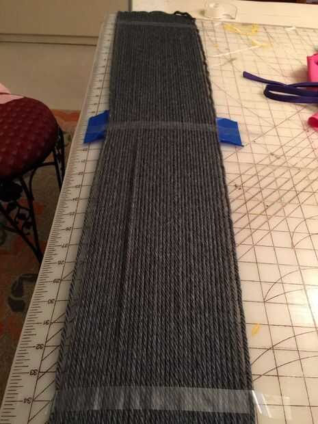 Paso 2: A partir de un canto, envuelva hilo asegurándose de mantener las filas paralelas de la cinta pegajosa. Usé la madeja entera.