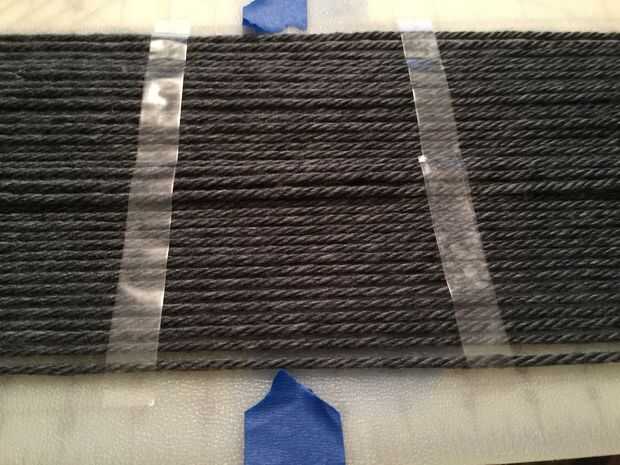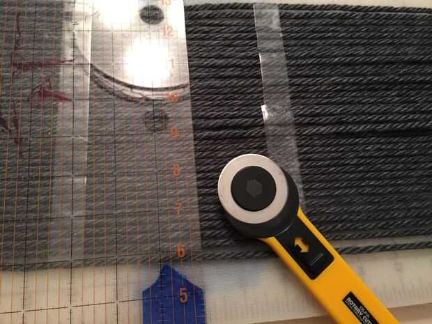 Corta el centro del hilo con tijeras o una regla y el cortador rotatorio. No quitar ninguna de la cinta. Apartar el pelo y bandana.