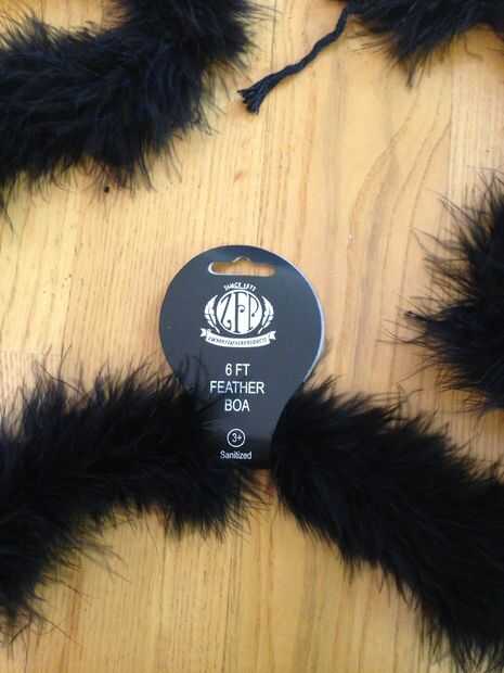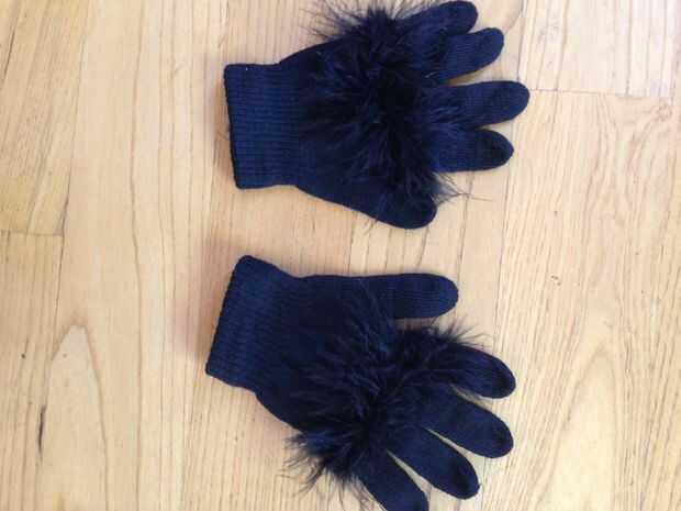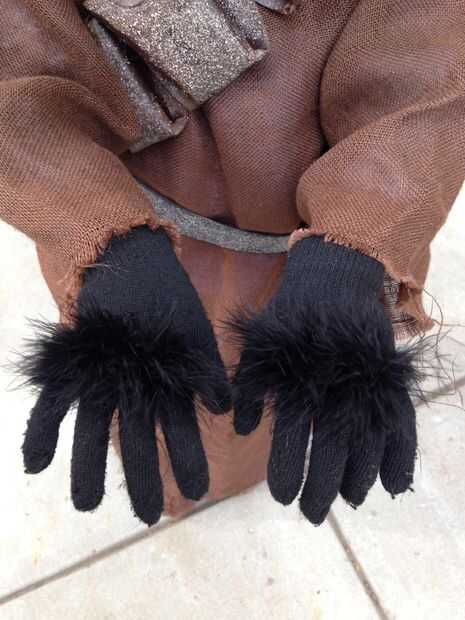 Después de ver la escena entre los Jawas, tío Owen y Luke sobre 30 veces, me di cuenta de que los Jawas tienen las manos negras con un poco de piel en la espalda. Fui a la tienda de dólar y tiene los guantes (2 pares por un dólar). Tenía esta boa de plumas y pensé que podría funcionar bien para la piel, sobre todo porque sería oscuro. Cosí una tira de 3" de la boa en cada guante, libremente a mano.