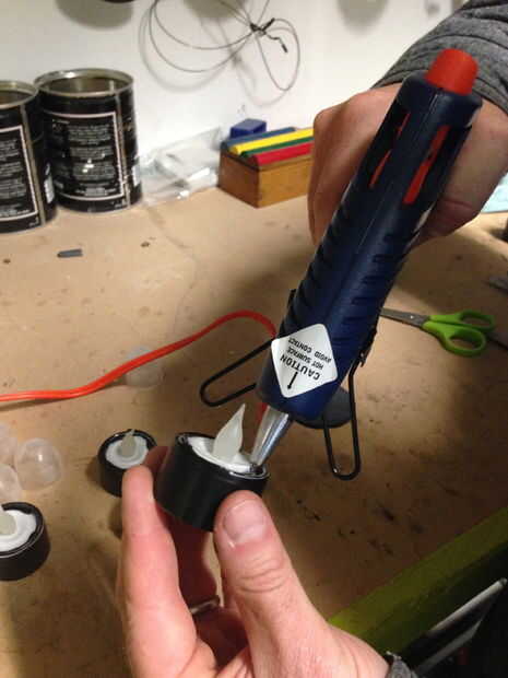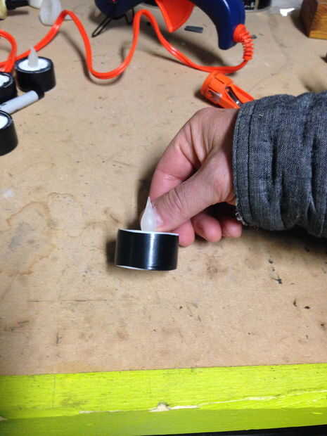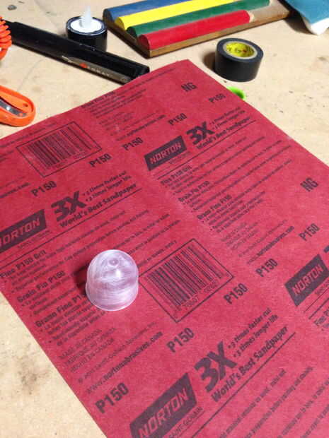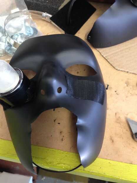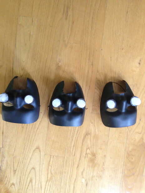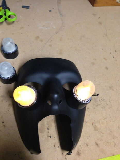 La máscara era lo que pensé sería el reto más grande, pero era más fácil de lo que pensaba que sería.  Hice algunas investigaciones en internet y luego lo modificó para hacerlo más fácil.  He comprado máscaras negro lisos en la tienda de Halloween de espíritu.  Entonces conseguí pilas luces de té en el de Michael.  Tienen un poco apagado/encendido en la parte inferior así que puede apagarlos cuando no está utilizando. Para difundir la luz, utilizamos los contenedores que vienen pequeños juguetes de máquinas de la bola de goma. Lija la parte del mundo y caliente-pegado a la luz del té.  Utilizamos cinta aislante negra para cubrir los laterales de las luces de té.  Comenzamos utilizando sólo una pequeña cantidad de regular velcro para sujetar los "ojos" a la máscara pero eso no fue lo suficientemente fuerte así que nos fuimos con la fuerza industrial velcro.  Cortamos la barbilla de la máscara ya que iba a ser prácticamente invisible bajo la malla negra de la campana, que hizo más fácil para los Jawas respirar.
