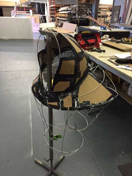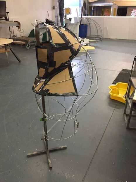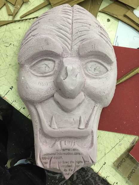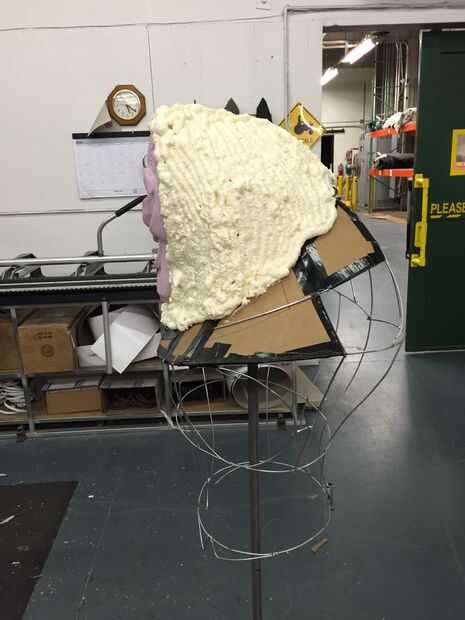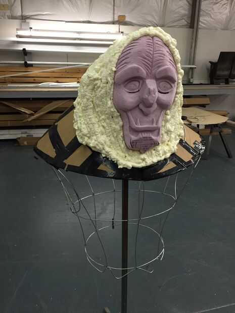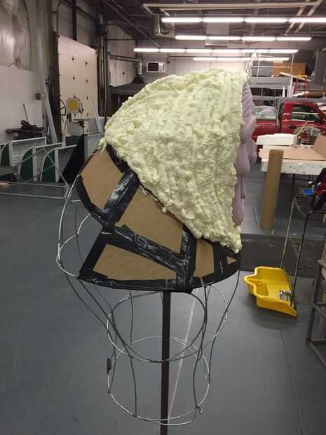 a continuación esculpida la cara de espuma de color de rosa y unido al marco. El siguiente fue cartulina y cinta para rellenar las aberturas. Y por último rocíe espuma para esculpir el cabello.