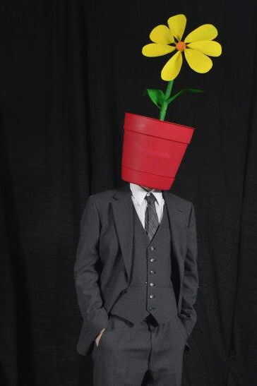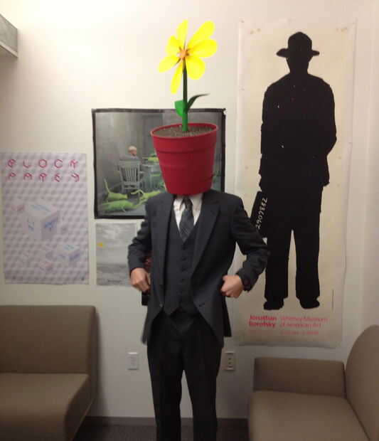 Me corte un orificio en la parte inferior de la maceta y utiliza una tachuela para empujar los agujeros para ver fuera de. Hay probablemente un agujero de cientos de la cúpula en un rectángulo frente a mis ojos que me da una visibilidad muy limitada. Cortar un círculo de la base de la espuma como una tapa. Un anillo de cerdas se pega a la parte inferior de la tapa, lo que lo mantiene en posición en mi cabeza. La flor es mad cerda Junta y pegamento caliente y entonces jadeó con pantalón acíclico. Suciedad se une a la tapa con pegamento de aerosol.