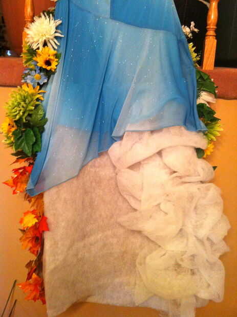 decidí que mi mejor opción era hacer toda la parte trasera del vestido en invierno. En este punto no sé qué material utilizar. Fui a la tienda de dólar para ver las faldas de nieve que pones en la base del árbol de Navidad. Pensé podría funcionar pero era demasiado delicada. Fui a WalMart y encuentra el bateo de poliéster para acolchar. Incluso el producto fino era grueso pero puede rasgar por la mitad y manojo hacia arriba para que se vea la luz y mullidas. Había un montón de volumen en la parte delantera del vestido así que había que asegurarse de que tenía el mismo efecto en la parte posterior.