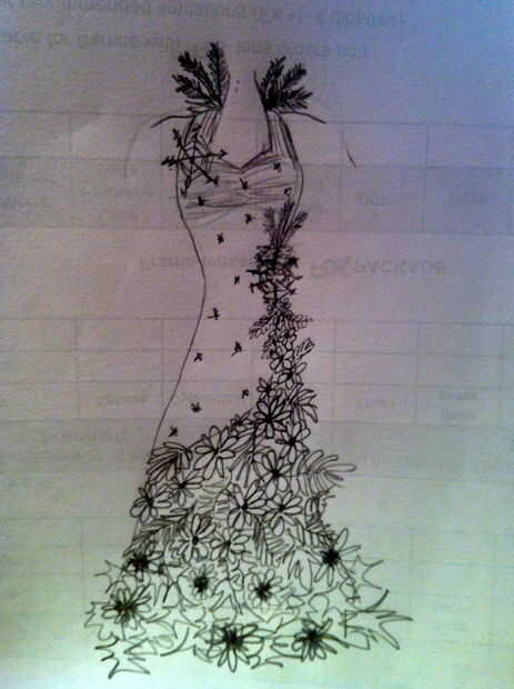 Después de que compré el vestido de la tienda tuve una mejor idea de lo que quería hacer. Que bosquejar mi idea. Quería de alguna manera se combinan las 4 estaciones. Ahora era tiempo para ir de compras de flores y hojas.