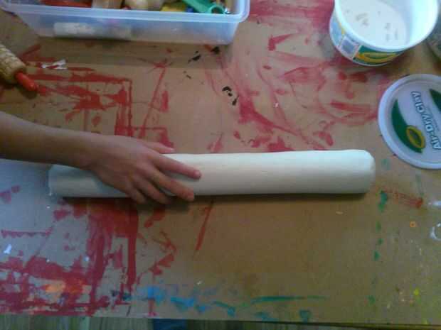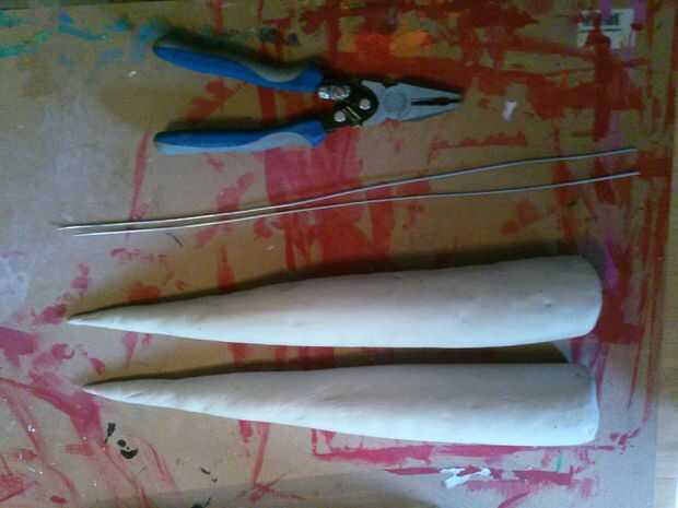 usaba una bañera de aire barato endurecer la arcilla. No es necesario que endurezca, pero es lo que encontré que era barato. Rollo de la arcilla en un registro, dividir igualmente y luego formar en dos conos. También tomé 2 pedazos de alambre pesado que mantendría su forma e inserta el alambre por la mitad de cada cono.