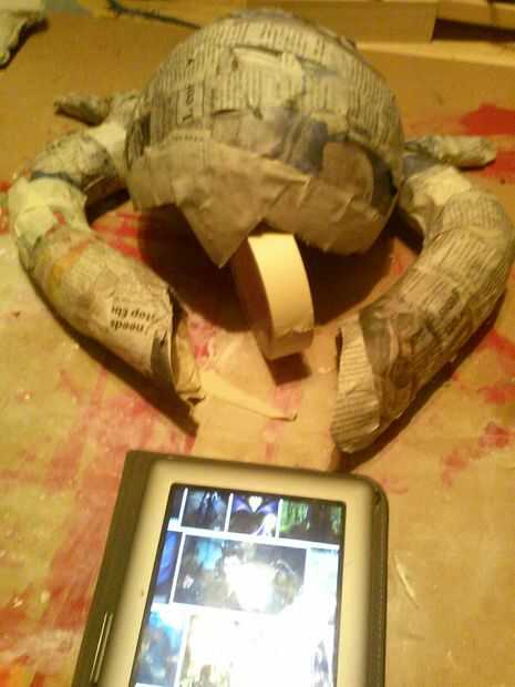 Revienta el globo en la tapa de scull. No tengo una foto de él, pero también hacer un corte hasta la parte posterior de la tapa de scull. Esto es necesario para obtener. A continuación, probar el gorro. Probablemente no se verá bien. Haga adicional se encuentra en la tapa del scull, luego se superponen los bordes o rellene los huecos con cinta de enmascarar hasta el gorro con la forma de la cabeza.