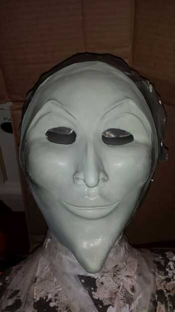 La máscara fue esculpida con la arcilla, moldeado con escayola y corrió con el monstruo fabricantes de látex. Es una media máscara con elástico. Solía cepillos y una máquina de cepillo de aire pintura y agrega brillo a la sombra de ojos.