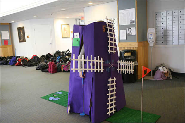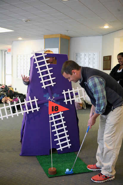 un campo de golf portátil fijado mis hijos y diseñado y construido para guerrilla improvisada juegos en demanda - cualquier parque, cualquier momento.Suministros incluyen cerca de 30 hojas pequeñas de fieltros y 18 hojas de fieltro blanco llano y tac