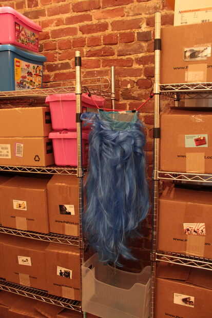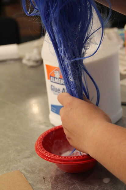Una vez que su peluca 's la longitud deseada, dunk en pegamento. Elmers está bien. Los pelos de su peluca es de plástico, así que no se molestan con productos para el cabello adecuado - pegamento mejor trabajado. Después de que has saturado completamente, cepillo a través de nuevo con el peine como mejor puede. Colgar a secar durante la noche.