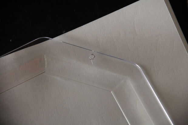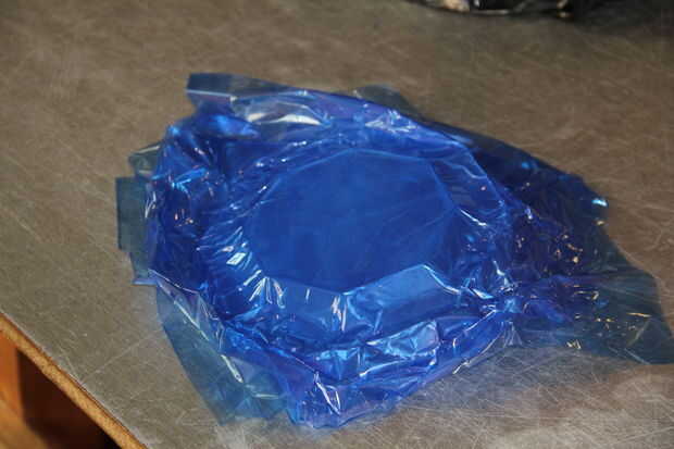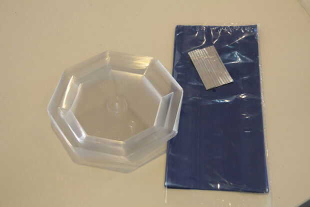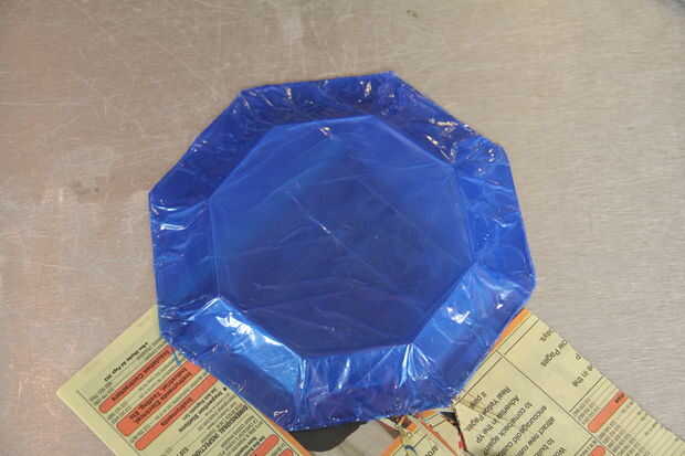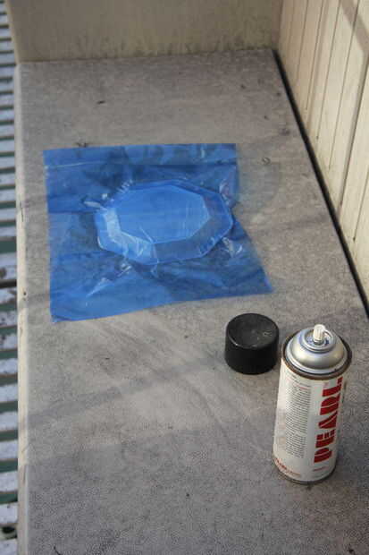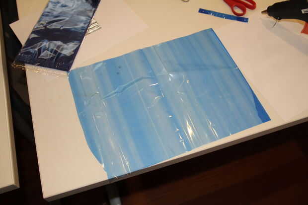 Una vez que tenga agujeros, es el momento de añadir algún color! Cortar una bolsa abierta por lo que es una sola capa. Luego, utilizando adhesivo en aerosol, aplicar una cantidad fina e incluso a la parte superior de su joya. Coloque la bolsa en la parte superior y alise cualquier burbuja. Repetición de unas pocas capas. Entonces, usando un cuchillo del exacto, cortar los bordes.