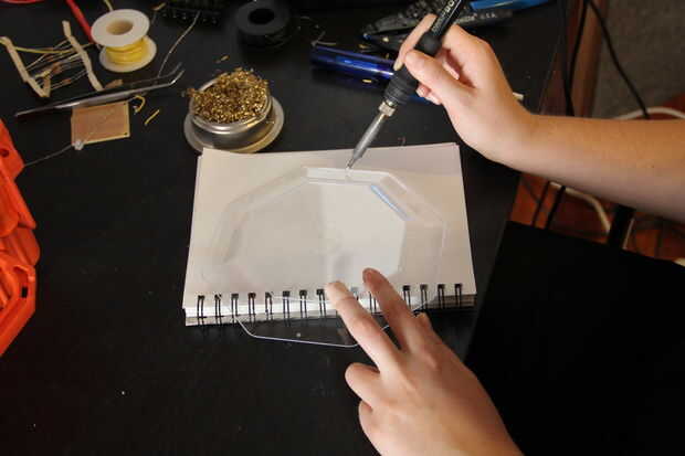 Usted querrá obtener algunos agujeros en el plato, por lo que fácilmente usted puede coser en el leotard. Después de un par encuentros fallidos con diferentes ejercicios o agujero-golpes, me di cuenta de calor era mi mejor opción. Utilicé un soldador para derretir rápidamente 2 agujeros en mi "joya", uno en la parte superior, otro en la parte inferior.