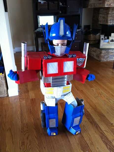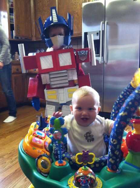 Cabe señalar que la persona en la casa más entusiasmada con el traje no era yo, o incluso mi hijo el traje. Era mi hijo. Cuando su hermano entró en la habitación en completo ajuar de Optimus Prime, el bebé saltó hacia arriba y hacia abajo en su exersaucer como un martillo neumático y gritó con deleite.