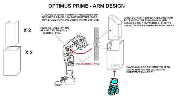 En cuanto a los brazos, tuve la suerte de que mi basura del garaje incluido una bisagra policéntrica que utilizado para estabilizar los brazos superiores e inferiores. Vea el adjunto diseño para ayudarle a visualizar cómo se crearon los brazos. Déjeme saber si usted tiene más preguntas sobre los brazos y algunos de los pequeños detalles.