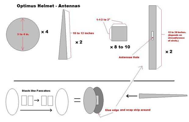 Finalmente en cuanto a los discos de lado, sólo recortar 4 discos redondos idénticos, entonces para espacios interiores tomar pequeños trozos de cartón y apilarlos como panqueques. Idénticas en número así que ambos discos son incluso. El sándwich los trozos pequeños con 2 discos y pegar en su lugar. Envolver luego con el pegamento hacia fuera del borde con una delgada franja que cubre el espacio sándwich. Secado largo corte 2 tiras que antannae (igual longitud) entonces medir por ahí ancho en la parte de la franja del disco. Corte los listones en los discos de sólo lo suficientemente grandes como para el antannae luego poner pegamento en las puntas y fijar en la bodega. Conecte a las aletas exteriores y ya tienes un casco de Optimus.