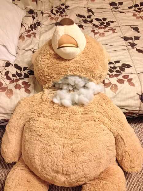 Ahora necesitas una entrada. Corte la parte inferior del oso abierto, utilizando la misma técnica que antes. Este agujero debe ser lo suficientemente grande para su torso caber a través.