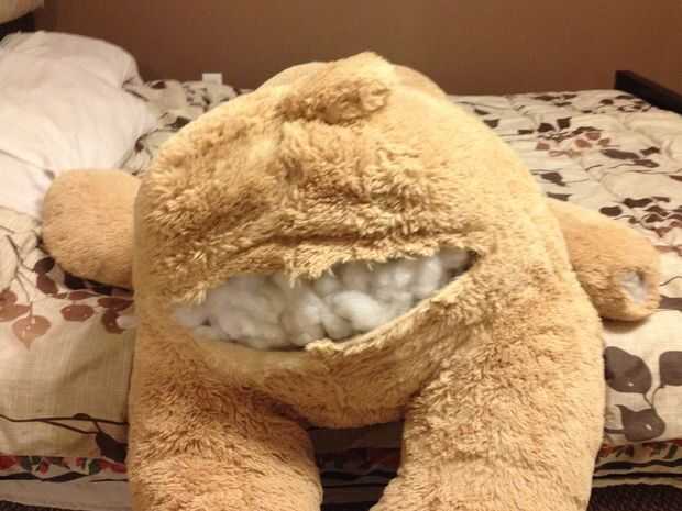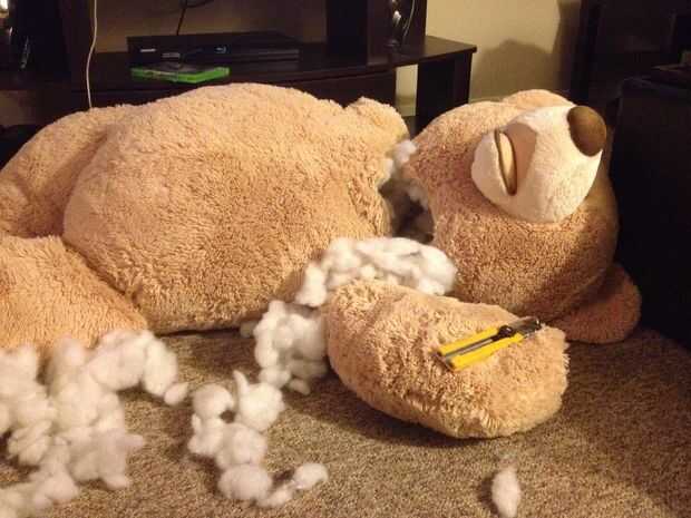 Esto también es un buen momento para tomar fotos de un asesinato/suicidio de peluche y enviarlas a tus amigos y compañeros de trabajo.