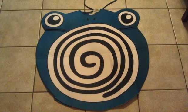 El Poliwhirl es prácticamente sólo 2 círculos de tela cosido juntos, abierto en la parte inferior, con una abertura en la espalda en la parte superior con cuerdas para atar y corta un arco pequeño para la zona del cuello y aberturas para los brazos en el círculo del frente