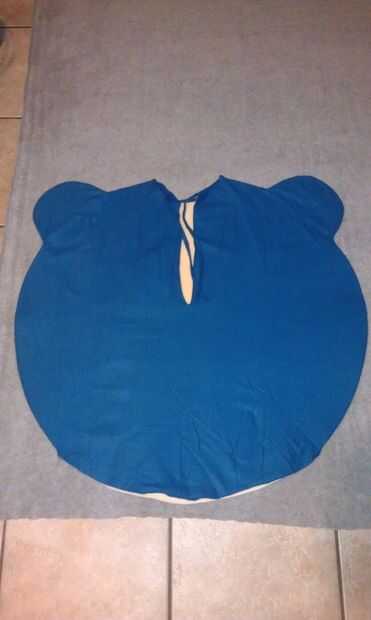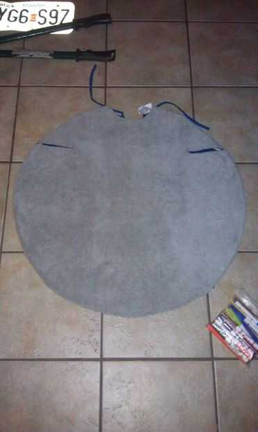 Metido los ojos de poliwhirl en el traje para dejar sólo la forma del círculo normal, alineada el paño grueso y suave con el traje, prender y coser todo alrededor del círculo. Asegúrate de coser sólo a la capa superior del traje cuando llegues a la abertura en la parte inferior, no a través de ambos o no tendrá ningún espacio para las piernas.