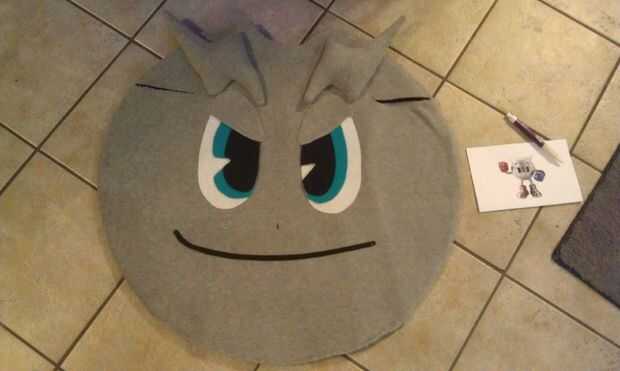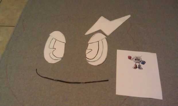 Arreglar los ojos, boca y cejas en el traje para ver donde tienen que ir. Utilice el adhesivo en aerosol para poner todo en. Incluso las cejas. Inicialmente sólo pegué les sobre con adhesivo en aerosol para mantener mientras que coserlas, pero llevó a cabo muy bien en su mayor parte. Una ceja cae después de unos pocos usos, pero no usar mucho pegamento ya que planeaba sobre costura. Usted decide si desea coser o no.