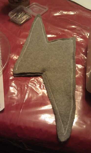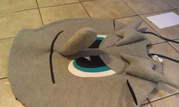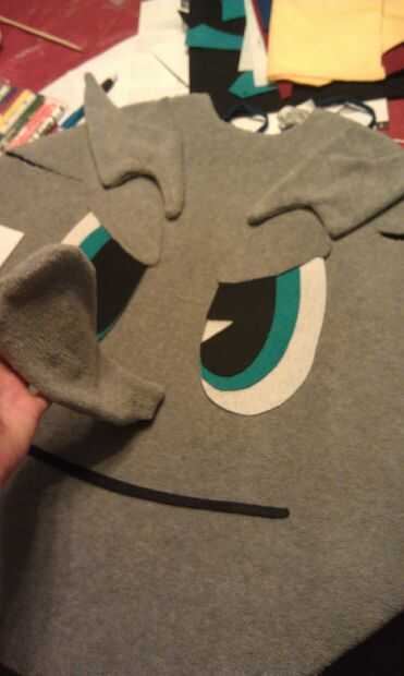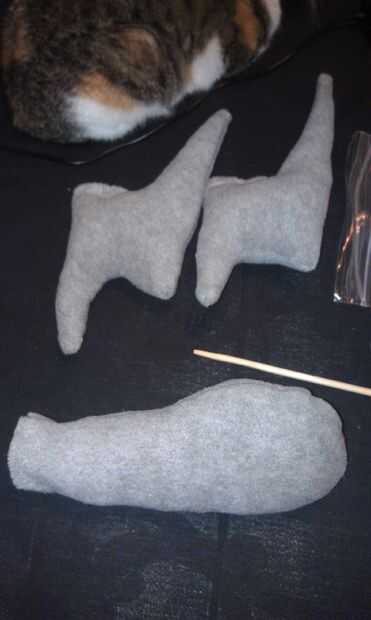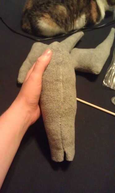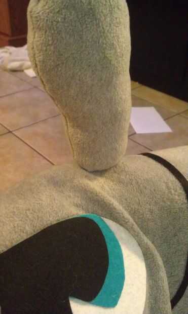 Aquí está la parte más difícil. He marcado donde debe ir y cortar un agujero allí la nariz. Luego inserta el extremo abierto de la nariz en el agujero, cubrió a y cosido. Era un dolor hacerlo. Para hacer la nariz permanezca para arriba, usted tiene que cosa desde la nariz hasta más arriba en el traje de "frente" repetidamente hasta que se queda para arriba.