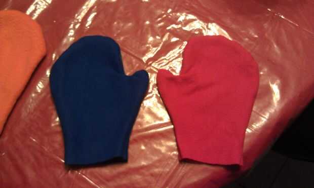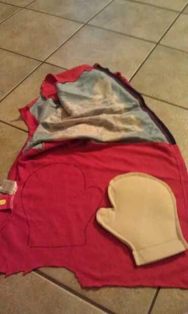 El traje de Poliwhirl vino con guantes que a trazado en tela roja y azul para los guantes. Coser y voltear de adentro hacia fuera.