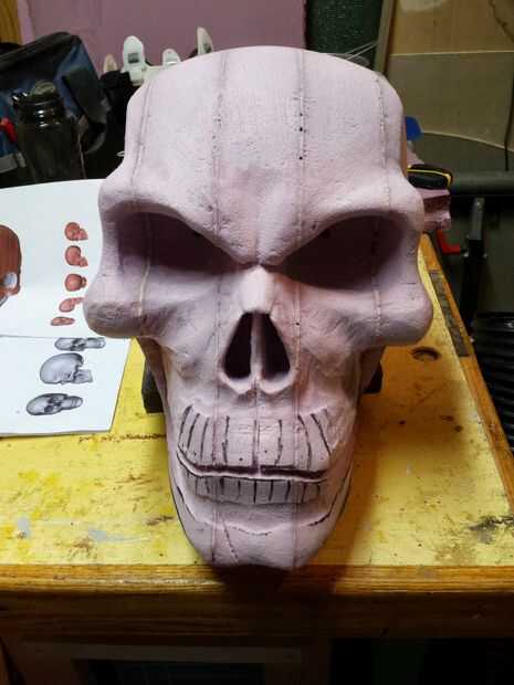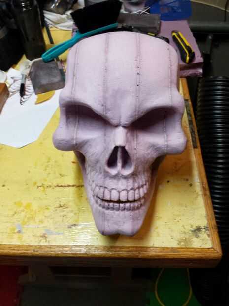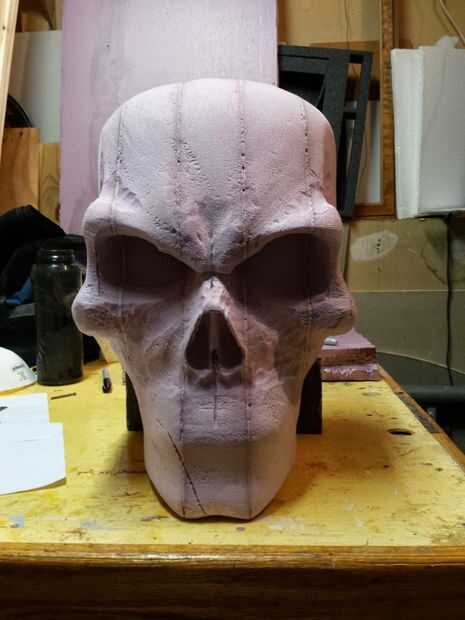 Lo primero fue conseguir el tamaño básico del cráneo que funcionara en el reaper. Tenía que ser más grandes que cualquier cabeza humana pero no tan grande que parece goofy. Esta parte involucrada sierras de mano, raspadores y cepillos de alambre. En este punto, el cráneo es aún más grande de lo que quería pero yo sabía que se reducirá en tamaño mientras continuaba esculpir los detalles. Mejor empezar grandes.