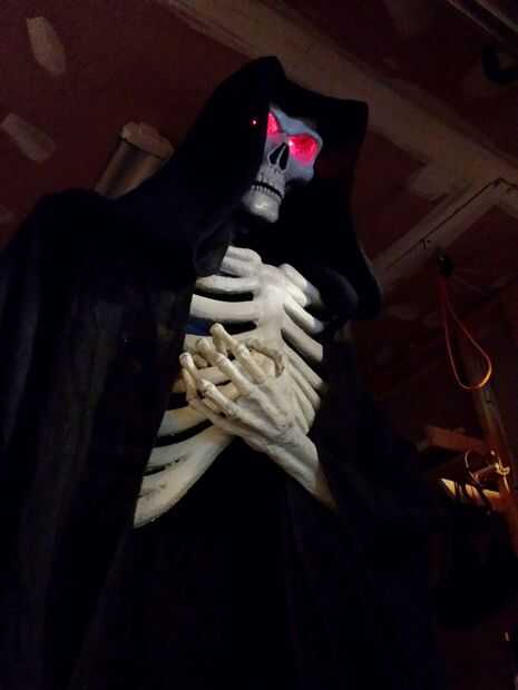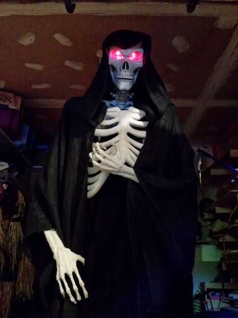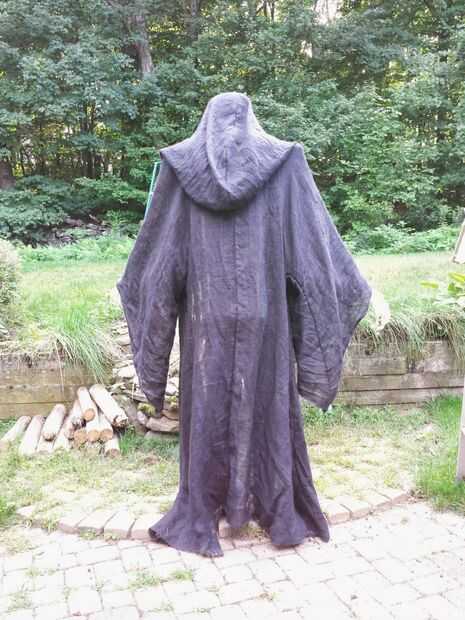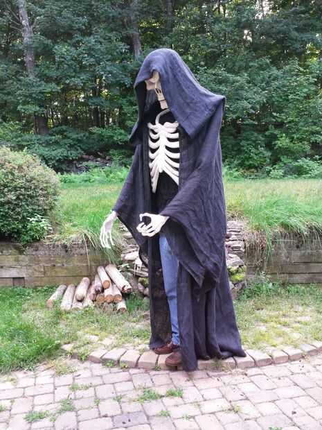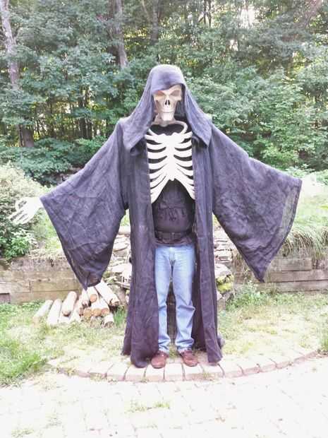 mirando la capa de reaper, colocado en un Jedi o Sith capa para este traje. Esto fue una elección perfecta porque quería el manto a fluir en el viento como mueve alrededor. Tener una sola pieza de material envuelto alrededor parece que llevas un vestido y no da mucho miedo. Hay un montón de planes en internet en cómo crear este manto. La parte difícil lo fue dimensionado para el Reaper. A 8' de altura, tardó cerca de 24 yardas de arpillera negra y tuve que estirar el material en la entrada de mi casa para marcar hacia fuera y hacer los cortes.
