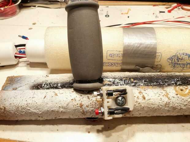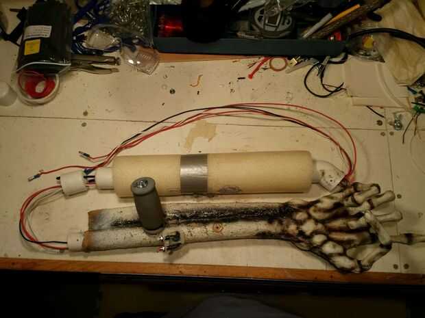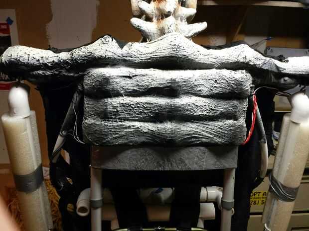 Grip para manipular los brazos justo por debajo de los codos. Todos los cables corrieron a la parte trasera del marco y creé algunas áreas detrás de los hombros que llena la parte posterior del traje y mantenga las baterías. Tengo muy buena visibilidad dentro de este traje y usar una capucha de nylon negro sobre mi cara por lo que incluso cuando las luces rojas, usted no puede ver los detalles detrás de las costillas creando un maravilloso efecto hueco detrás de las costillas.