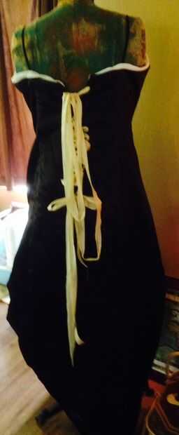 Tengo un vestido negro, que utiliza para otro traje y es un buen punto de partida, como deshuesado, red, meta un poco aquí y allí modificar aquí y allá. Primero he creado un cordón hasta volver a ella, utilizando hilo de botón, crear bucles con un lápiz de tamaño y la cremallera con tiza de sastre de la pre-marca. Llevó sobre una hora o así y chico fueron dolor de empujar la aguja a través de las manos. Entonces tomé la cinta que robaban de mesa de coser de mi madre, ella siempre tenía un poco de esto o aquello escondido en la gaveta inferior. Ese cajón es como Mary Poppins alfombra bolsa siempre parece interminable y lleno de cosas wonderous.