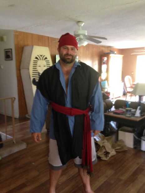 Salvó los brazos de la t-shirt y sutura cerrado a lo largo de la parte superior para crear la tapa de la noche. Una espada de espuma de 5 dólares de una tienda de renombre y pirata instantáneo. Añadir un pendiente tal vez algunos traje alfileres para hacerla destacar.