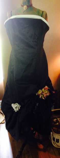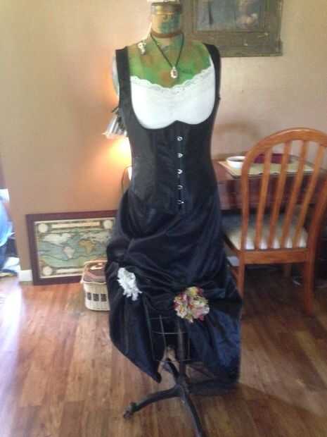 Encontré un tutorial de la flor de la cinta en youtube que me ha obsesionado en la actualidad estos días. Hacia fuera viene viejos retazos de tela y mi pistola de pegamento. He creado algunas flores con botones antiguos de nuevo mesa de coser de mamá de la bondad. Les cosió en la falda en un detalle de la pick-up para darle apariencia de una falda cancán. Uno de mis amigos del trabajo me prestó el corsé underbust y añadí una blanco tapa del tanque para modestia después de todo es un evento familiar y no soy la clase de chica.