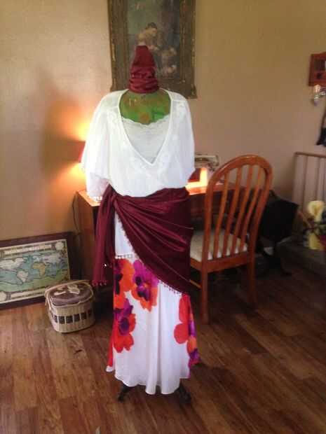 Usé un pañuelo como una faja, a veces que tienes que cortarlas en puntada medio longitudinalmente entonces ellos terminan a fin de obtener la longitud correcta. También usé un pañuelo como una envoltura de cabeza también. Los zapatos pueden ser sandalias. trabajo botas todo lo que funcione para usted. Si hace frío puede llevar fácilmente capas por debajo.