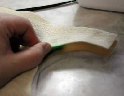 Saltar el coser y el torneado interior (pasos 2 y 3). En cambio, emparedado de la pieza tan, el bateo (recortado 1" más corto alrededor de los bordes) y el pedazo crema y pegamento caliente alrededor de los bordes. Presione para sellar. Pegamento caliente velcro como se indica en el paso 3.