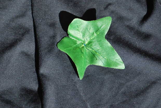 Encontrar un hilo verde y coser a través de la hoja un par de veces. Hacer un nudo y cortar el extra.